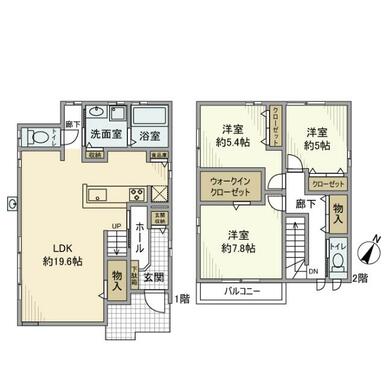 | 間取り | 3LDK(洋室5畳/洋室5.4畳/洋室7.8畳/LDK19.6畳) | 主要採光面 | 南東 |
